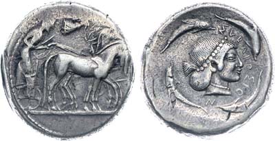 Серебро. 17,33г. Сиракузы. Аверс: Бюст Аретузы-Артемиды вправо и украшен нитями жемчуга; вокруг бюста четыре дельфина; легенда "ΣV-RA-KO-ΣION". Реверс: бига вправо, в руке возницы жезл, сверху фигурка благословляющей богини Ники вправо. Sear 913. AU.