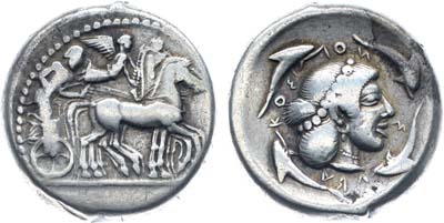 Серебро. 17,43г. Сиракузы. Аверс: Бюст Аретузы-Артемиды вправо и украшен нитями жемчуга; вокруг бюста четыре дельфина; легенда "ΣV-RA-KO-ΣION". Реверс: бига вправо, в руке возницы жезл, сверху фигурка благословляющей богини Ники вправо. Sear 913. AU.