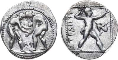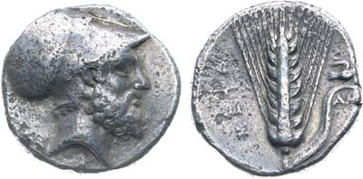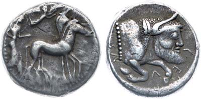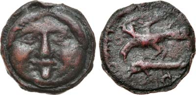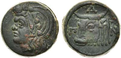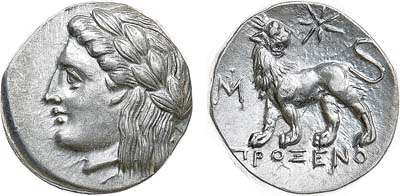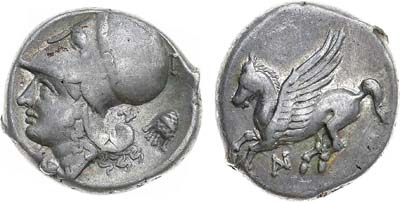 Серебро. 17,08г. Аверс: голова Персефоны вправо; легенда "KOPAΣ". Реверс: Ника стоит вправо, молот в опущенной правой руке, гвоздь в поднятой левой, собирается прикрепить шлем к трофею; слева внизу в поле трискелион; легенда "AΓAΘOKΛEIOΣ". AU.