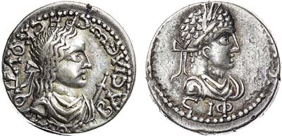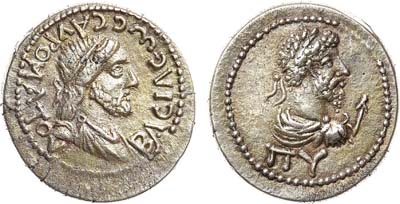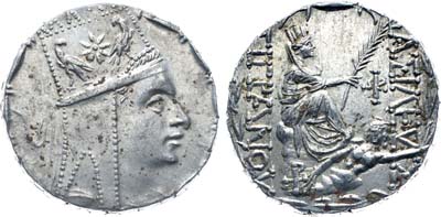 Серебро. 15,92г. Тигранокерт. Аверс: портрет Тиграна II в диадеме, украшенной звездой между двумя орлами. Реверс: богиня Тихе, сидящая на камне с лавровой ветвью в руке; внизу речной бог Оронт, плывущий вправо; на камне внизу монограмма; изображение в венке; легенда "BAΣIΛEΩ-Σ / TIΓPANOY". UNC.