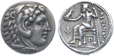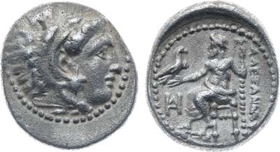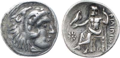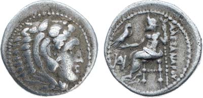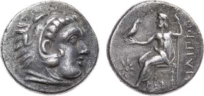 Серебро. 17,05г. Амфиполь. Аверс: голова Геракла в львиной шкуре вправо. Реверс: изображение Зевса Этофора, сидящего на троне влево с орлом в правой руке и скипетром в левой; легенда "ΑΛΕΞΑΝΔΡΟΥ". XF.