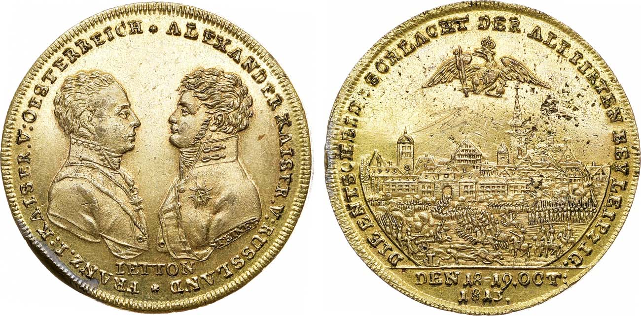 Бронза, серебрение, золочение. 13,7г. Диаметр 33 мм. Германия, Нюрнберг. Медальер И.Т. Штеттнер (аверс — на обрезе рукава Императора Александра I: "STETNER"). Дьяков 368.2(R1). AU.
