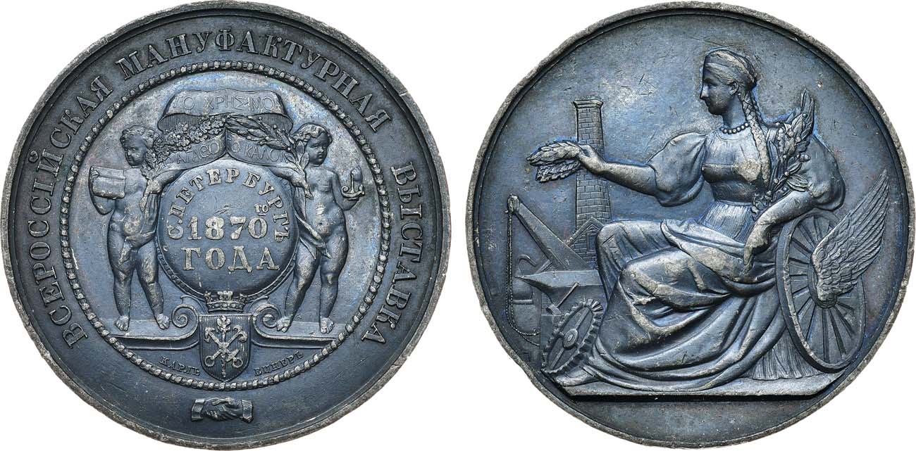 Свинцово-оловянный сплав. 33,47г. Диаметр 54,7 мм. Санкт-Петербургский монетный двор. Медальер Ш. Винер (на аверсе под гербом "КАРЛЪ ВИНЕРЪ") Смирнов 694. Дьяков подобна 770.2(R0). AU.