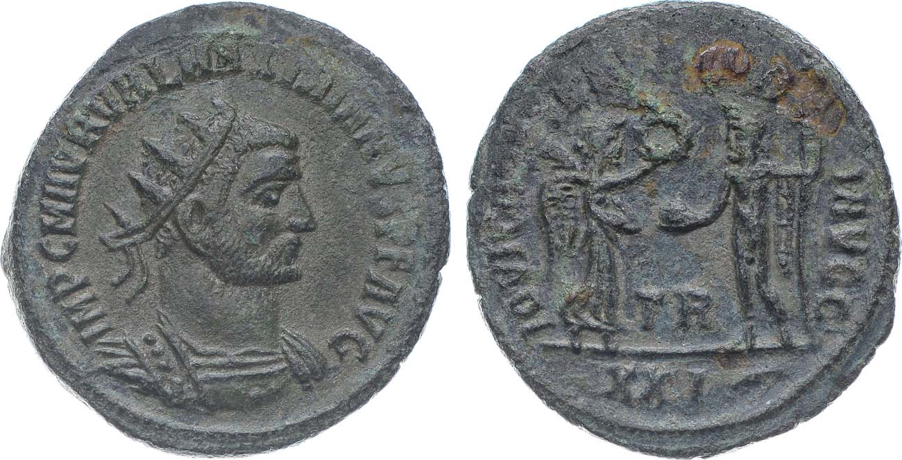 Биллон. 3,19г. Триполис. Аверс: портрет императора в короне вправо; круговая легенда "IMP C M A VE VAL MAXIMIANVS P F AVG". Реверс: изображение Виктории, передающей венок Максимиану; круговая легенда "IOVI CONSERAVATORI AVGG". Sear 13145. AU.