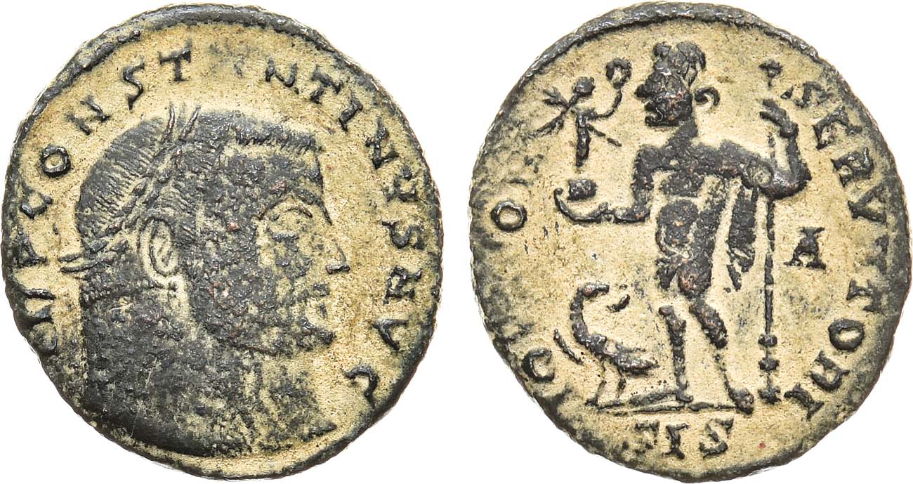 Биллон. 2,84г. Сисция. Аверс: профиль императора Константина; круговая легенда "IMP CONSTANTINVS AVG". Реверс: стоящий, обращённый влево Юпитер, опирающийся на скипетр и держащий в правой руке фигуру богини Виктории с венком в руке на державе. У ног Юпитера орёл вправо с венком. Знак монетного двора "SIS". Знак оффицины (отделение монетного двора) "Δ" (=4) на поле. Круговая легенда "IOVI CONSERVATORI" ("Юпитеру-хранителю"). Sear 15940. AU.