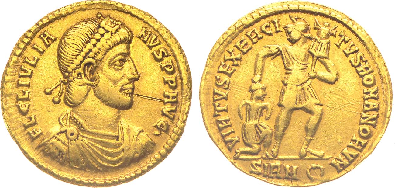 Золото. 4,52г. Сирмий. Аверс: бюст императора в диадеме и кирасе вправо; легенда "FL CL IVLIANVS PP AVG". Реверс: фигура солдата, в левой руке держит трофей, правую руку кладет на голову преклонившего колено пленника; легенда "VIRTVS EXERCITVS ROMANORVM", под обрезом изображения "SIRM" и венок. XF.