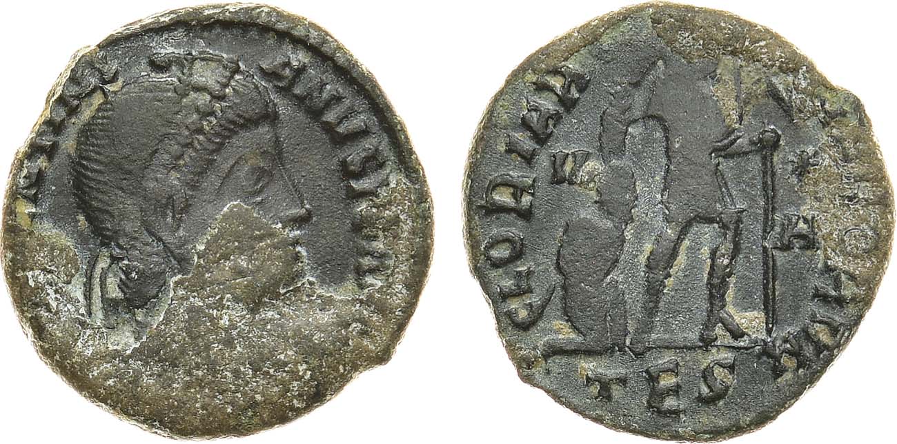 Бронза. 2,4г. Салоники. Аверс: "DN VALENTINI ANVS PF AVG" драпированный бюст императора вправо. Реверс: "GLORIA ROMANORVM", под линией обреза "TES". Sear 19453. VF.