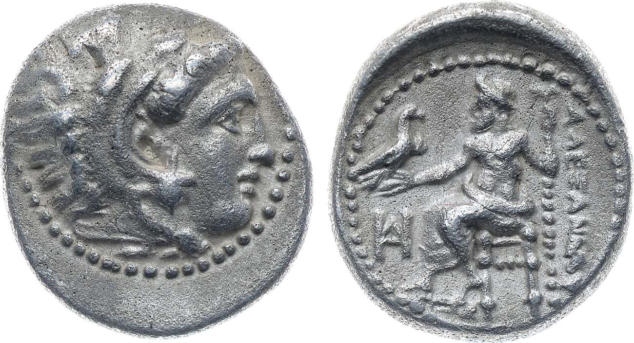 Серебро. 4,01г. Аверс: изображение Геркулеса в львиной шкуре - вправо. Реверс: изображение Зевса на троне с орлом и скипетром - влево; монограмма на поле; вертикальная легенда "AΛΕΞANΔPOY". XF.