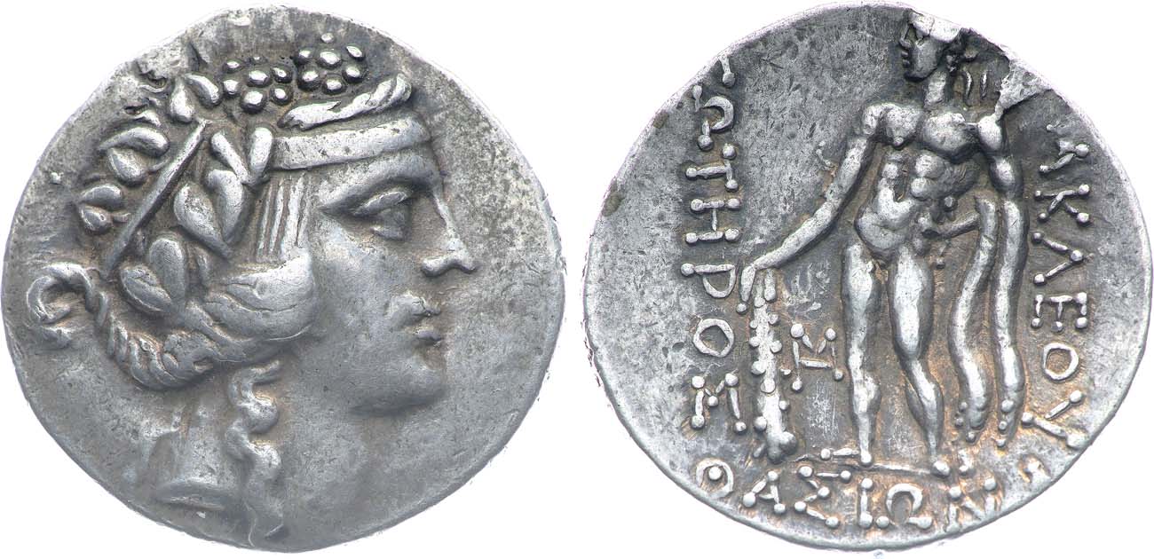 Серебро. 16,75г. Аверс: голова Диониса в короне вправо. Реверс: стоящий анфас Геракл в львиной шкуре и с дубинкой в руке; легенда "ΗΡΑΚΛΕΟYΣ / ΣΩΤΗΡΟΣ / ΘΑΣΙΩΝ". XF+.