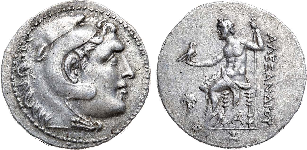 Серебро. 17,11г. Арад. Аверс: изображение Геракла в львиной шкуре вправо. Реверс: легенда "ΑΛΕΞΑΝΔΡΟΥ"; изображение Зевса, сидящего на троне - влево, левой рукой опирающегося на скипетр, с орлом на правой руке; внизу монограмма "АР". AU.