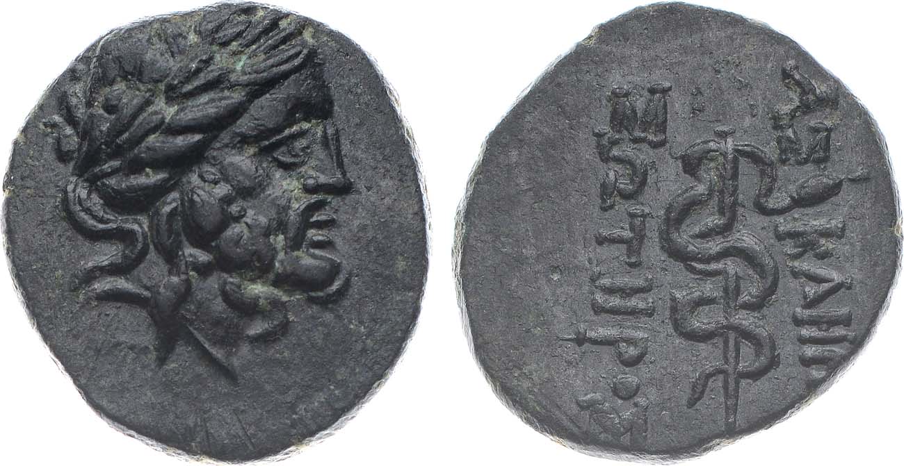 Бронза. 3,15г. Аверс: голова Асклепия в лавровом венке вправо. Реверс: змея обвивающая посох Асклепия, легенда "AΣKΛHΠIOΥ ΣΩTHΡOΣ" - "Асклепий спаситель". Sear 3971. AU.