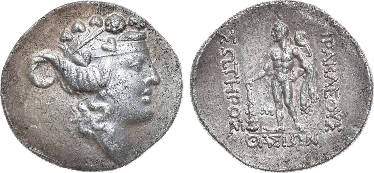 Серебро. 16,73г. Аверс: голова молодого, безбородого Диониса, обращенная вправо, его волосы связаны венком из плюща. Реверс: Преподобный Геракл стоит влево, опираясь правой палицей на землю, держит львиную шкуру над левой рукой. Монограмма на поле слева. SNG 1048. XF/AU.