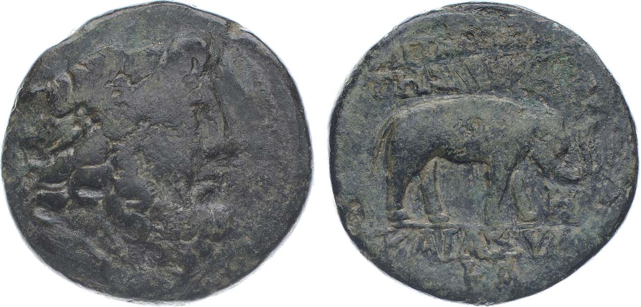 Бронза. 7,3г. Аверс: голова Зевса вправо в лавровом венке. Реверс: шагающий слон вправо, легенда "ΑΠΑΜΕΩΝ / THΣ IEPAΣ | KAI ΑΣΥΛΟΥ / MNA", под хоботом слона дата "ГMΣ" - 243 год. Sear 5867. F/VF.
