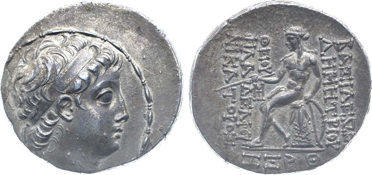 Серебро. 15,91г. Антиохия. Аверс: голова правителя в диадеме вправо. Реверс: сидящий Аполлон влево; вертикальная греческая легенда. AU.