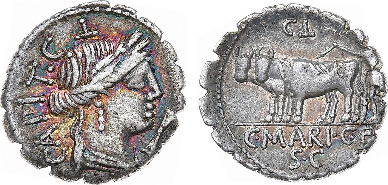 Серебро. 3,86г. Рим. Аверс: изображение Цереры вправо; легенда "CAPIT•СL". Реверс: фигура с двумя волами влево; легенда: "СL" сверху, "C•MARI•C•F S•C" в две строки под линией обреза. XF.