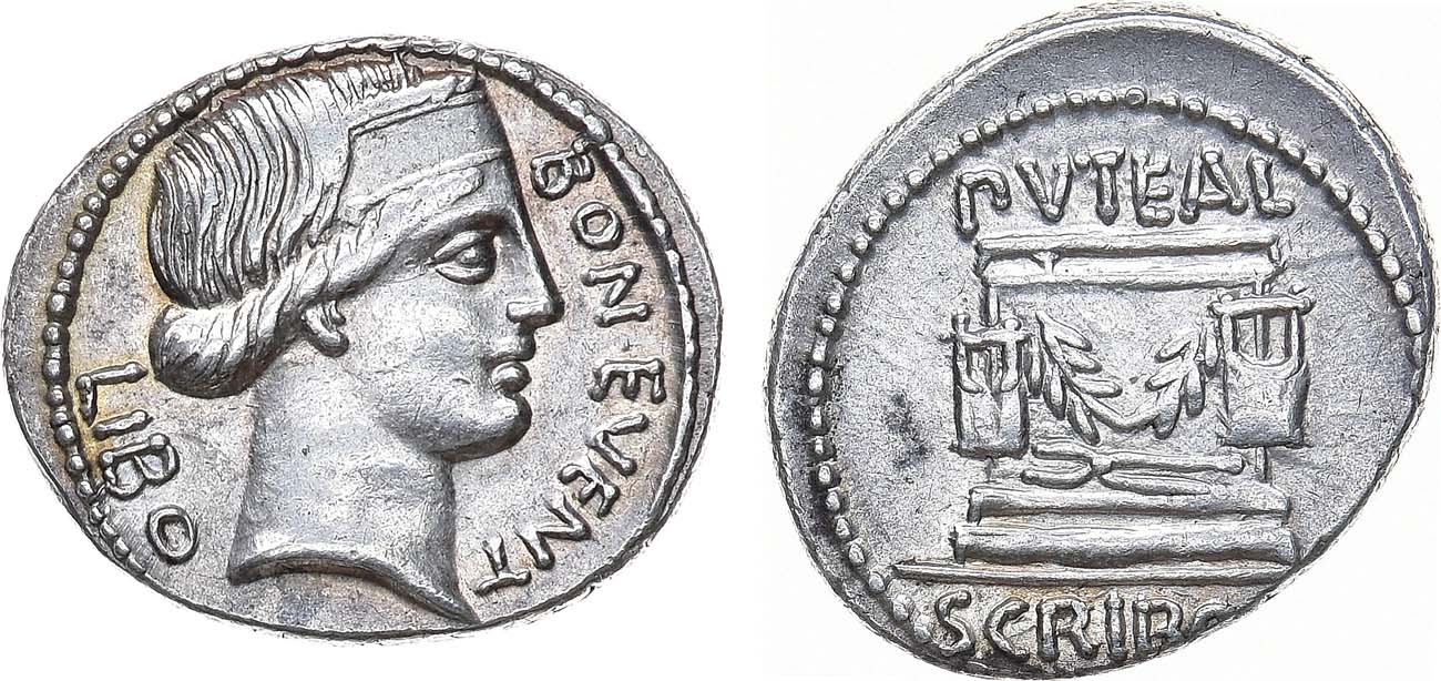 Серебро. 3,87г. Рим. Аверс: голова Эвентуса в диадеме вправо; легенда "BON EVENT / LIBO". Реверс: колодец, увешанный гирляндой; легенда "PVTEAL SCRIBON". AU.