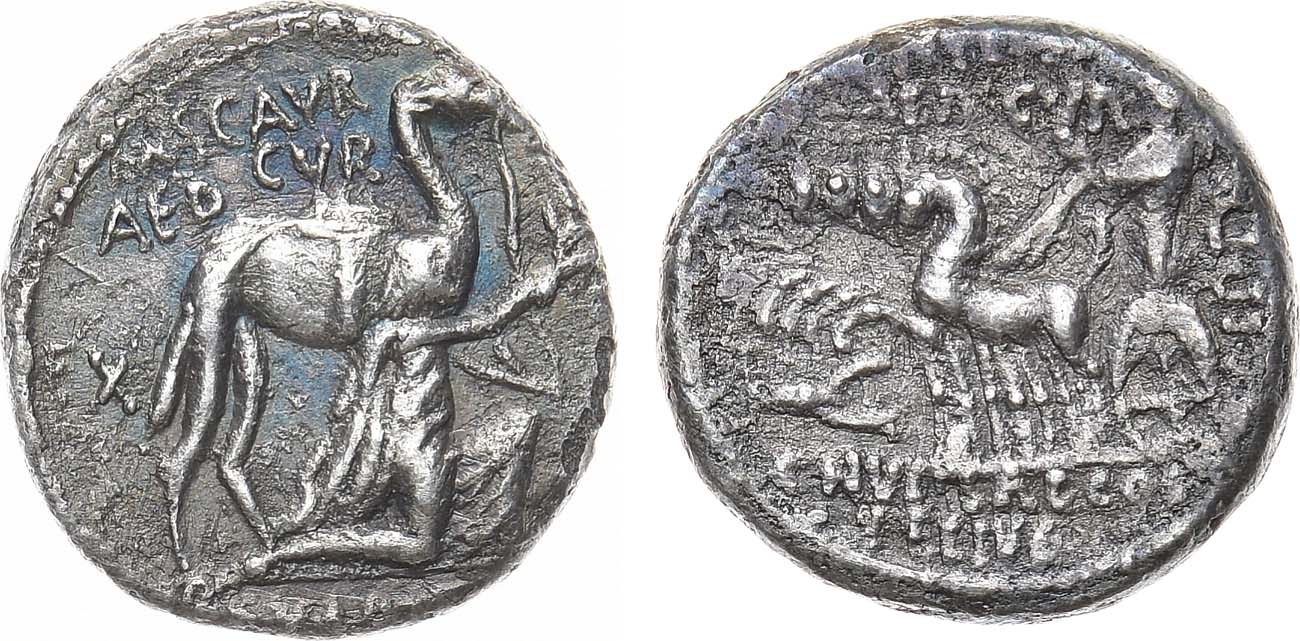 Серебро. 3,84г. Рим. Аверс: "M SCAVR / AED CVR / EX S C / REX ARETAS" Дромадер вправо, преклоняет колени, справа в поле "SC", внизу "ARETAS". Реверс: "P HVPSAEV / AED CVR / CAPTV / C HVPSAE COS / PREIVE " Юпитер управляет квадригой влево, в левой руке вожжи, правой метает молнии, скорпион под ногами лошадей. RRC 422,1b. VF/XF.