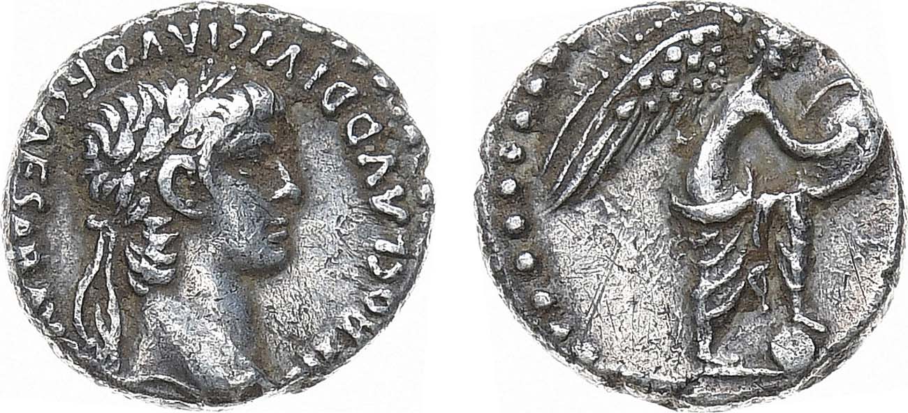 Серебро. 1,72г. Кесария. Аверс: голова Нерона в лавровом венке вправо; легенда "NERO CLAVD DIVI CLAVD F CAESAR AVG GERMANI". Реверс: Виктория поставила ногу на земной шар, оперев щит на колено. XF.