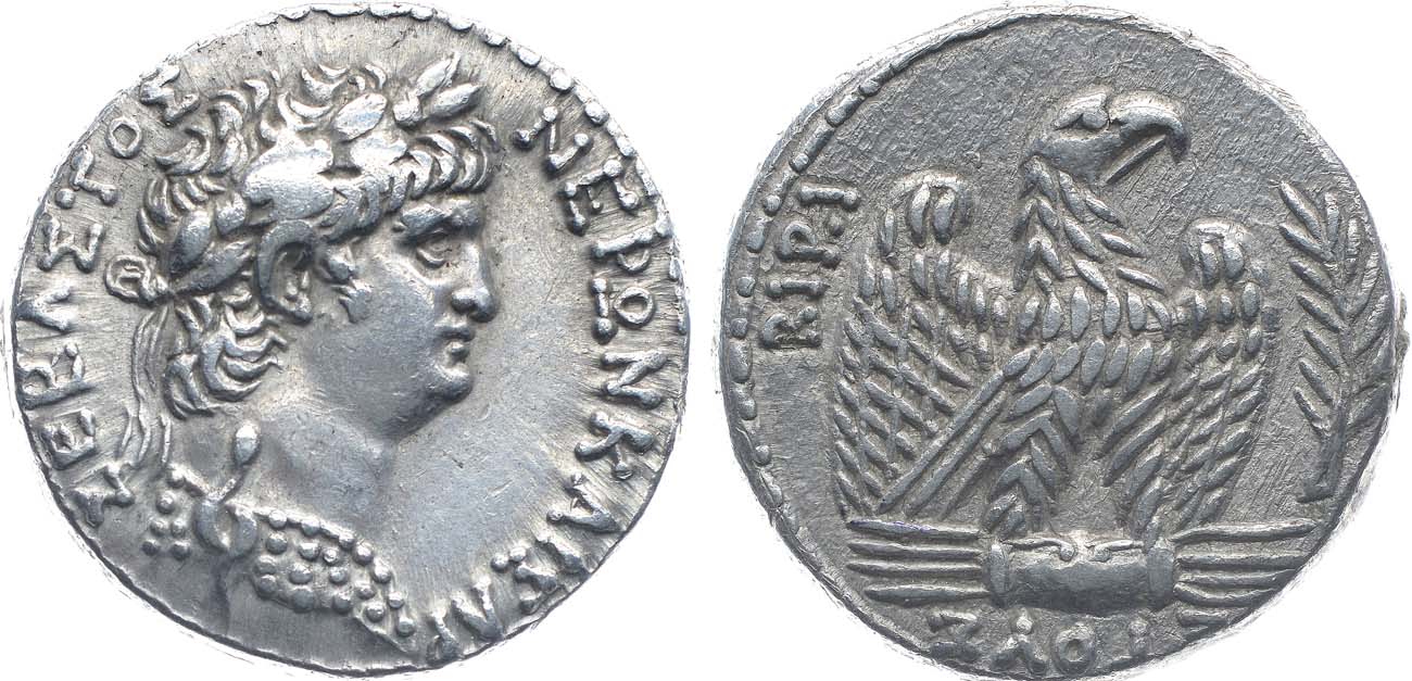 Серебро. 15,18г. Антиохия. Аверс: портрет Нерона вправо; легенда "ΝΕΡΩΝ ΚΑΙΣΑΡ ΣΕΒΑΣΤΟΣ". Реверс: орёл с распростертыми крыльями вправо; справа пальмовая ветвь; легенда "ETOΥΣ - RIP•I". XF/AU.