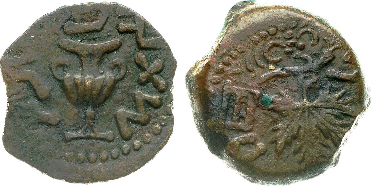 Бронза. 2,76г. Аверс: изображение виноградного листа на ветке; круговая легенда - обозначение даты на древнем иврите. Реверс: изображение амфоры с ручками; круговая легенда на древнем иврите "Свобода Сиона". XF+/AU.