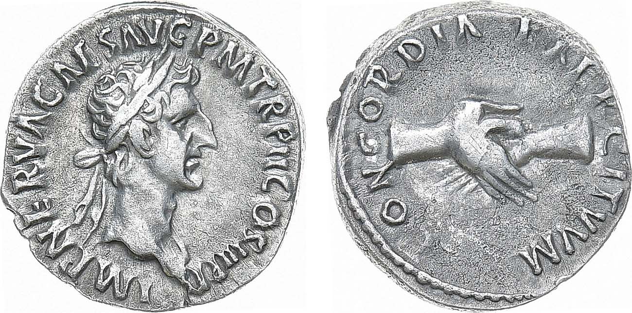 Серебро. 3,26г. Рим. Аверс: голова Нервы в лавровом венке вправо; легенда "IMP NERVA CAES AVG P M TR P II COS III P". Реверс: сложенные руки; легенда "CONCORDIA EXERCITVVM". XF.