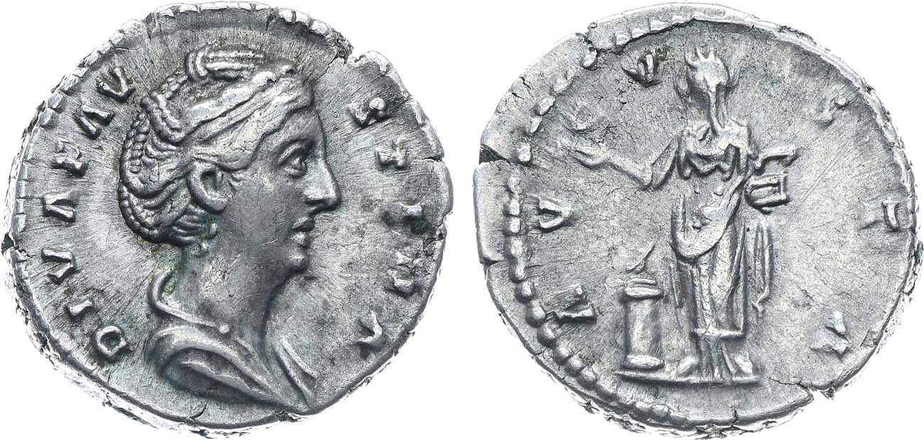 Серебро. 3,26г. Рим. Аверс: круговая легенда "DIVA FAVSTINA"; портрет Фаустины вправо. Реверс: круговая легенда "AVGVSTA"; ростовое изображение Пиетас у алтаря - вправо. Sear 4589. XF.