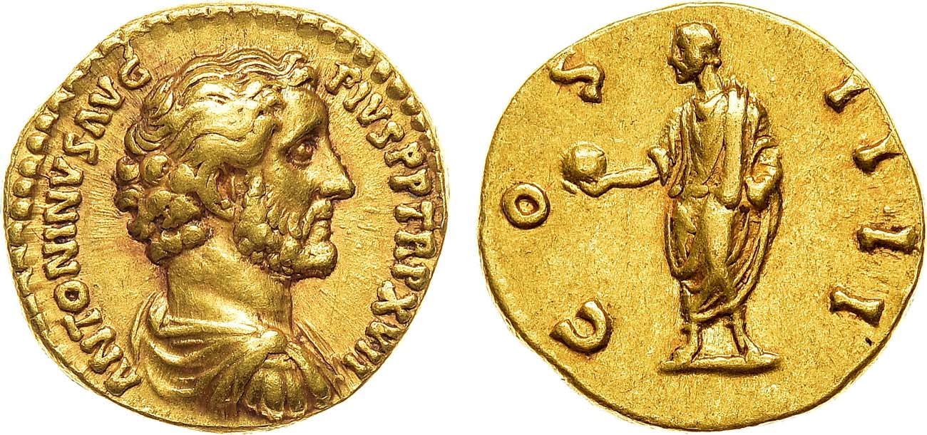 Золото. 6,76г. Рим. Аверс: круговая легенда "ANTONINVS AVG PIVS PP TR P XVII"; портрет императора вправо. Реверс: круговая легенда "COS IIII"; ростовое изображение Антонина в тоге влево. Sear 4004. RIC 206. XF+.