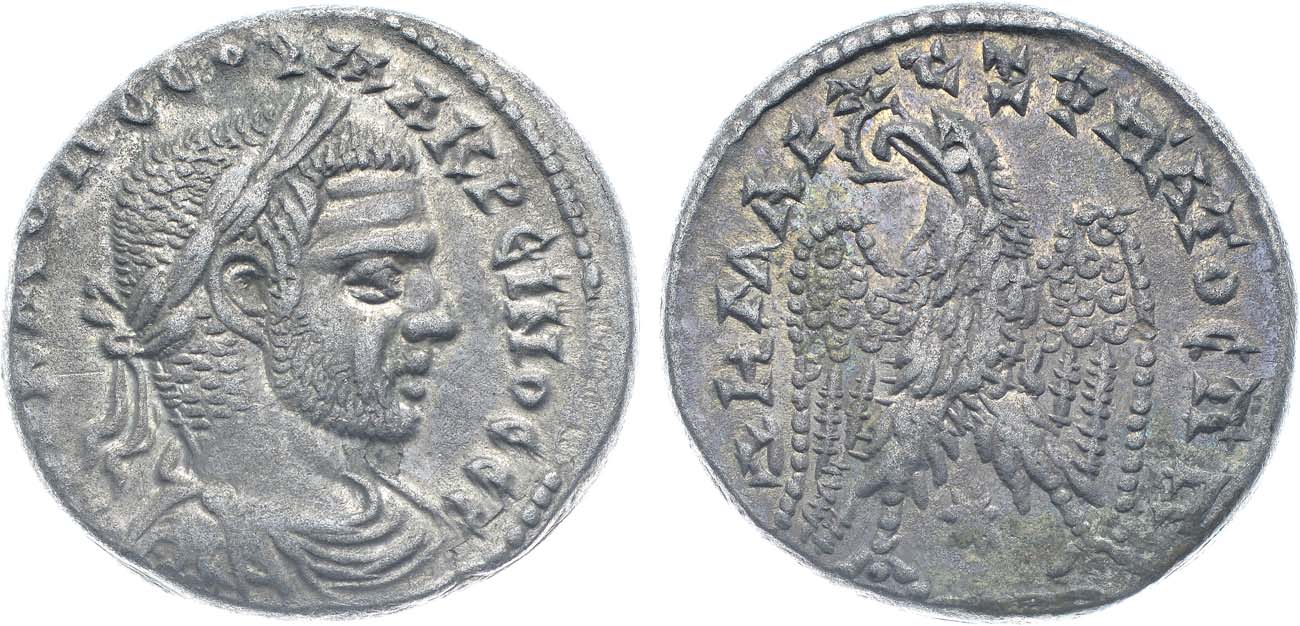 Серебро. 14,04г. Аверс: портрет императора Макрина в лавровом венке влево; круговая зеркальная легенда "AY•K•M•OΠ•CЄOY•MAKPЄINOC C". Реверс: изображение орла с распростёртыми крыльями - влево, между лап орла изображена голова влево; круговая легенда "ΔHMAPX•ЄΞ•YΠATOC ΠΠ". AU.