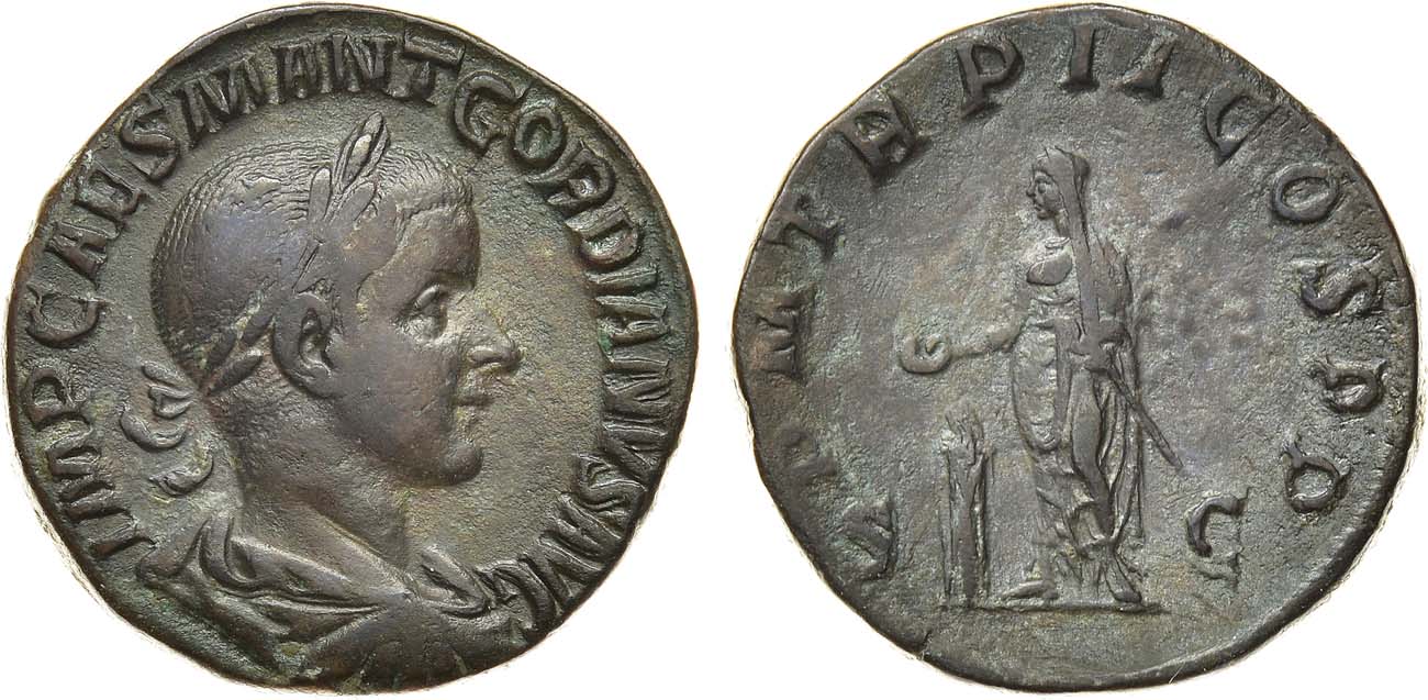 Бронза. 17,74г. Рим. Аверс: "IMP CAES MANT GORDIANVS AVG" драпированный бюст императора в лавровом венке вправо. Реверс: "PM TR P II COS PP/SC" Гордиан стоит влево, держит патеру над освещенным алтарем. Sear 8724. RIC 271. XF.