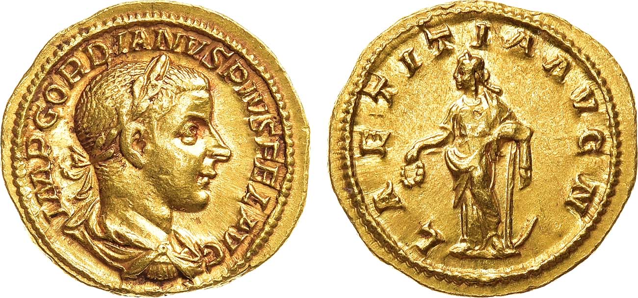 Золото. 4,95г. Рим. Аверс: "IMP GORDIANVS PIVS FEL AVG" драпированный бюст императора вправо. Реверс: "LAETITIA AVG N" Летиция держит венок правой рукой, а левой опирается на якорь. Sear 8572. RIC 101. UNC-.
