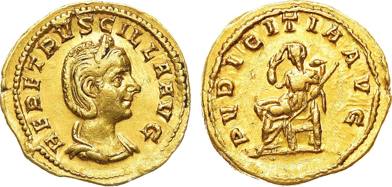 Золото. 4,89г. Рим. Аверс: круговая легенда "HER ETRVSCILLA AVG"; изображение Этрусциллы вправо. Реверс: круговая легенда "PVDICITIA AVG"; изображение Пудиции (богини стыдливости и целомудрия) на троне - влево с копьём в левой руке. Sear 9488. AU.