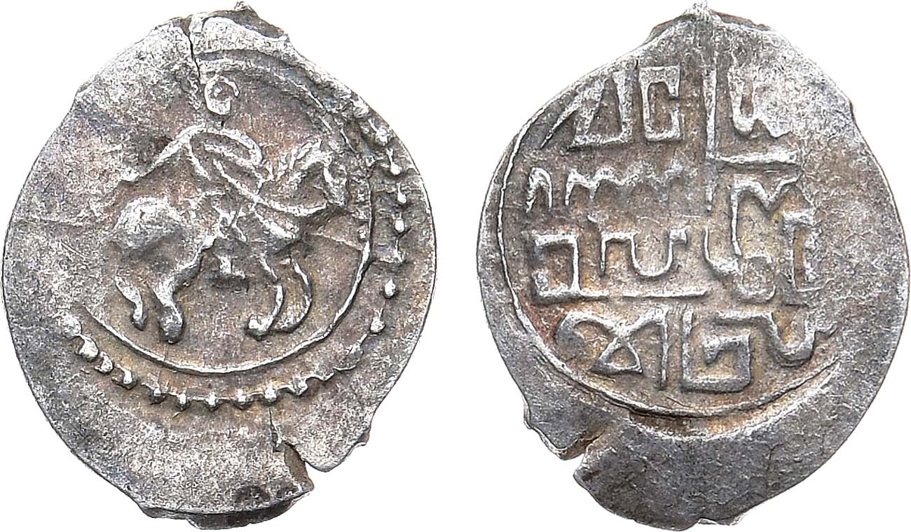 Серебро. 0,55г. Аверс: всадник с соколом вправо, под всадником головы змеи нет; точечный ободок с кольцом. Реверс: стилизованное подражание арабской легенде. ГП2 1768B (R-VII). AU.