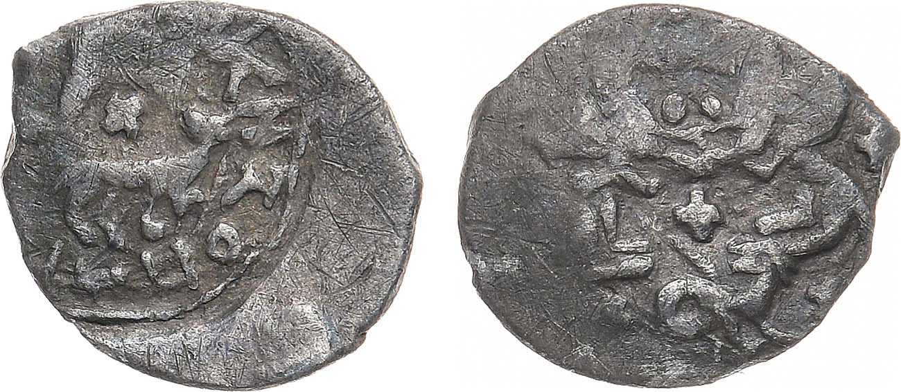 Серебро. 0,46г. Аверс: звери на задних лапах, крест между ними, круговая легенда ":КNZ ONДРѢН ДМТРЄВVЬ". Реверс: всадники, ряд крестов в поле, дракон под всадниками. ГП2 3692 (R-III). XF.