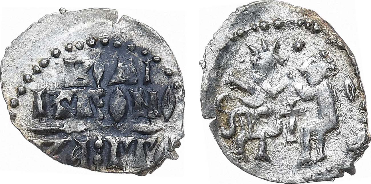 Серебро. 0,72г. Аверс: русская легенда в кресте. Реверс: сцена оммажа, слева князь с мечом сидит, обращен вправо. Знаки на поле реверса: в центре крест, точки вверху и внизу, справа литера "С", слева литера "О". ГП2 №7588T (R-IV). UNC.