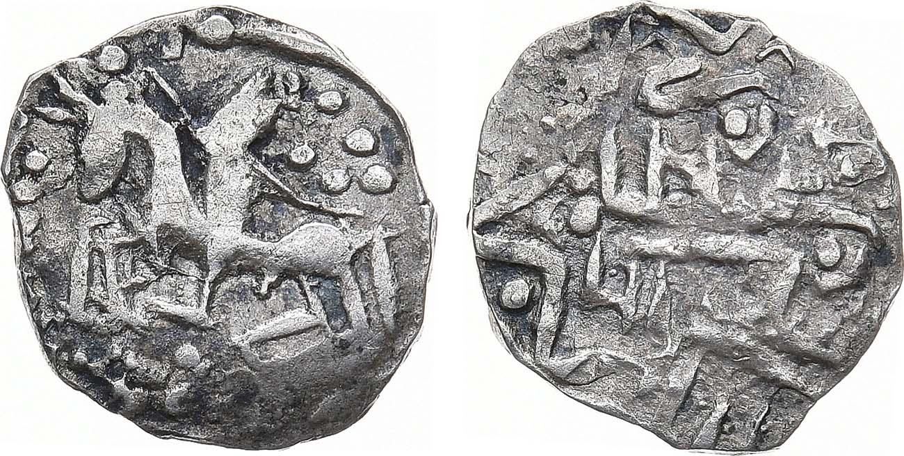 Серебро. 1,26г. Аверс: всадник с копьём влево, точки вокруг. Реверс: грубое подражание аверсу данга Абдуллаха зеркально. ГП2 6192C (R-I). AU.