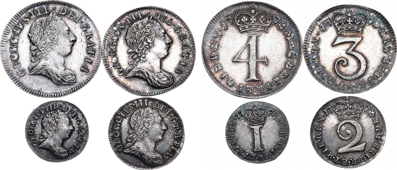 Серебро. 4 пенса 1772 года. Серебро. 1,94 г. Молодой портрет. Spink 3750. UNC. 3 пенса 1772 года. Серебро. 1,55 г. Молодой портрет. Spink 3753. UNC. 2 пенса 1772 года. Серебро. 1,05 г. Молодой портрет. Spink 3756. UNC. 1 пенс 1772 года. Серебро. 0.52 г. Молодой портрет. Spink 3759. UNC. Spink 3750, 3753, 3756, 3759.
