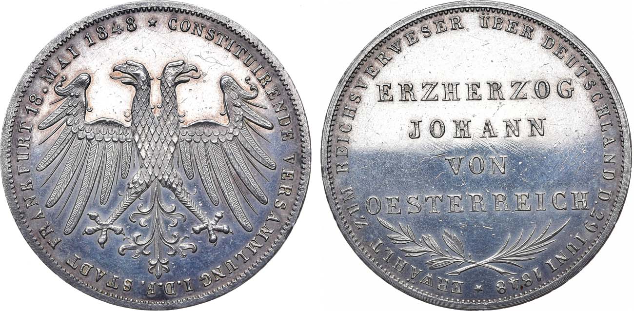 Серебро. 21,22г. Франкфурт-на-Майне. Тираж: 36065 экз. Отчеканена в память избрания австрийского принца Иоганна викарием. KM 338. AKS 39. Davenport 644. Thun 135.. AU/UNC.