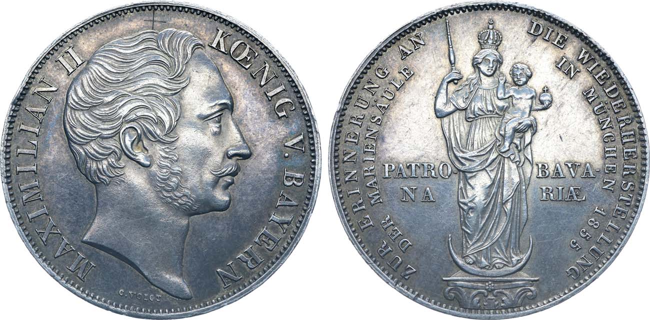 Серебро. 21,2г. Отчеканена по случаю восстановления Мариинской колонны (в честь пресвятой Девы Марии, покровительницы Баварии) в Мюнхене. Мюнхен. KM 848. AKS 168. AU.