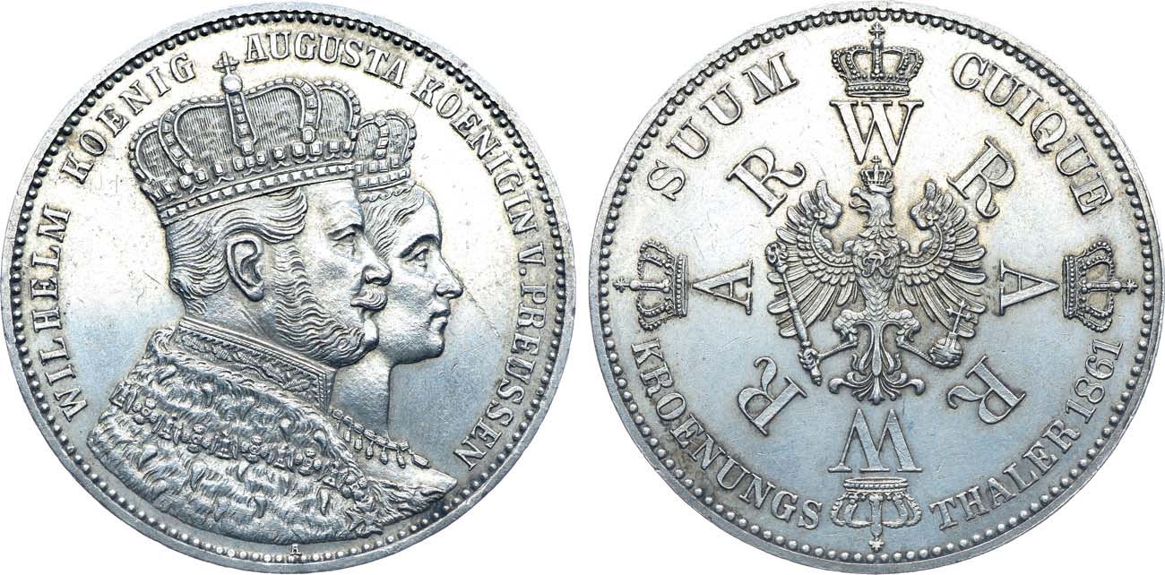 Серебро. 18,53г. Берлин (А). Отчеканена в память коронации Вильгельма I. Тираж 1000000 экз. Гурт: "GOTT MIT UNS". KM 488. AKS 116. Davenport 778. Jaeger 87. Olding 403. Thun 265, Kahnt 385. AU.