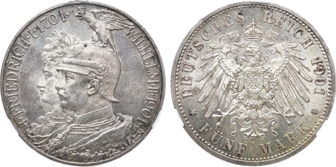 Серебро. Берлин (A). Отчеканена в память 200-летия Прусского королевства. KM 526. Jaeger 106. Weege 106.. MS 63.