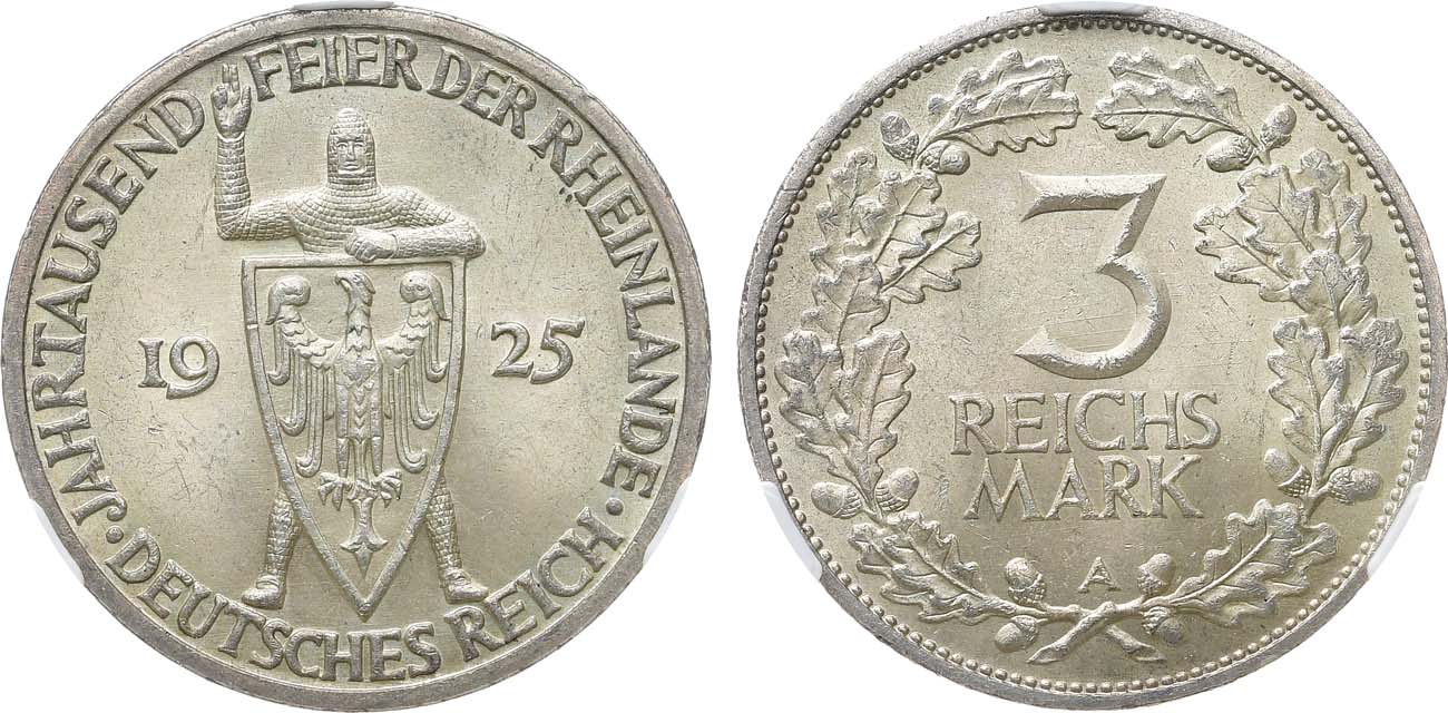 Серебро 500 проба. Берлин (А). Отчеканена в память 1000-летия Рейнской области (Рейнланда). KM 46. Jaeger 321. Weege 24. MS 63.