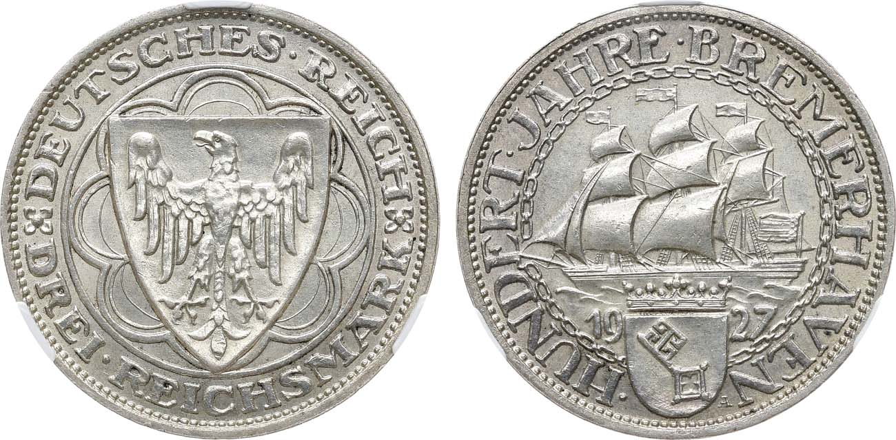 Серебро 500 проба. Берлин (А). Отчеканена в честь 100-летия города Бремерхафена. KM 50. Jaeger 325. Weege 27. MS 63.
