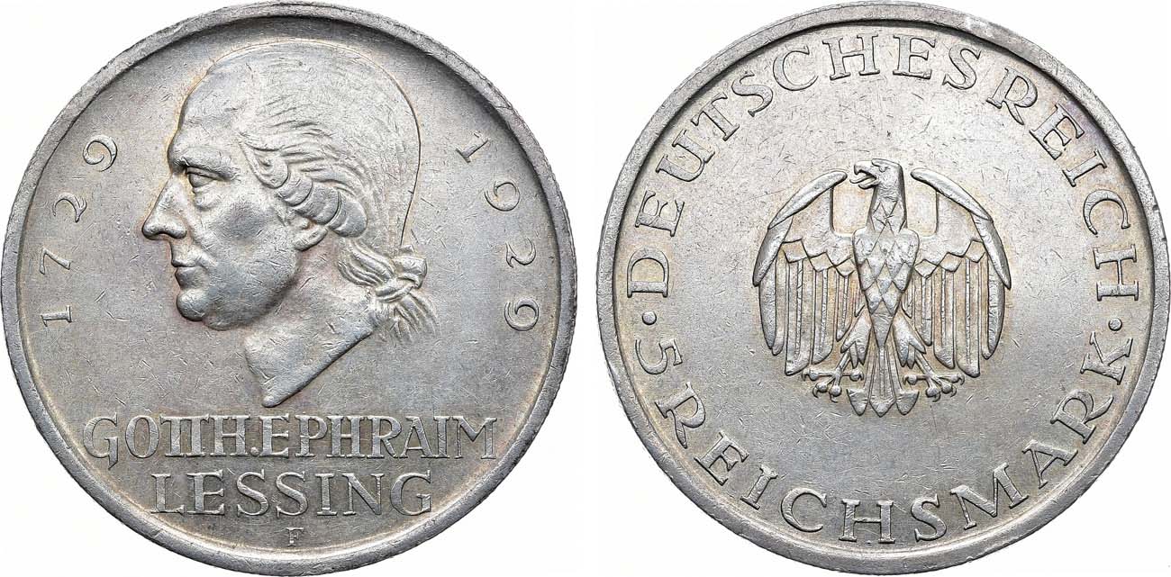 Серебро. 24,93г. Штутгарт (F). Отчеканена в память 200-летия со дня рождения Готхольда Лессинга. KM 61. Jaeger 336. Weege 37. AU.