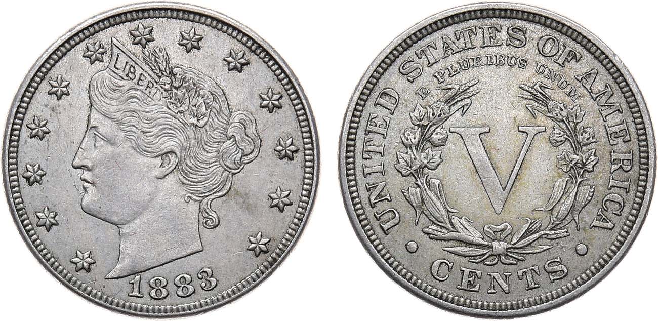 Первый год чеканки нового типа 5 центов с профилем Свободы. 5 центов 1883 года со словом "CENTS" на реверсе встречается реже, чем без слова "CENTS". Изначально в 1883 году эти монеты чеканились без слова "CENTS". В это же время злоумышленники начали покрывать их золочением и выдавать за 5 долларов. В том же 1883 году для пресечения подобных действий на реверсе монеты было помещено слово "CENTS", а девиз "E PLURIBUS UNUM" был перемещён в верхнюю часть реверса.