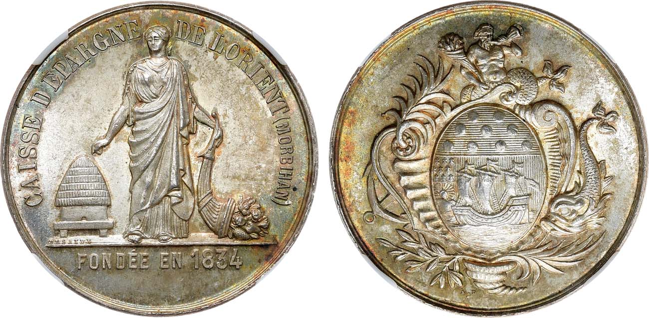 Серебро. Диаметр 33 мм. Парижский монетный двор. Без подписи медальера. Гурт: рог изобилия и "ARGENT". MS 66.