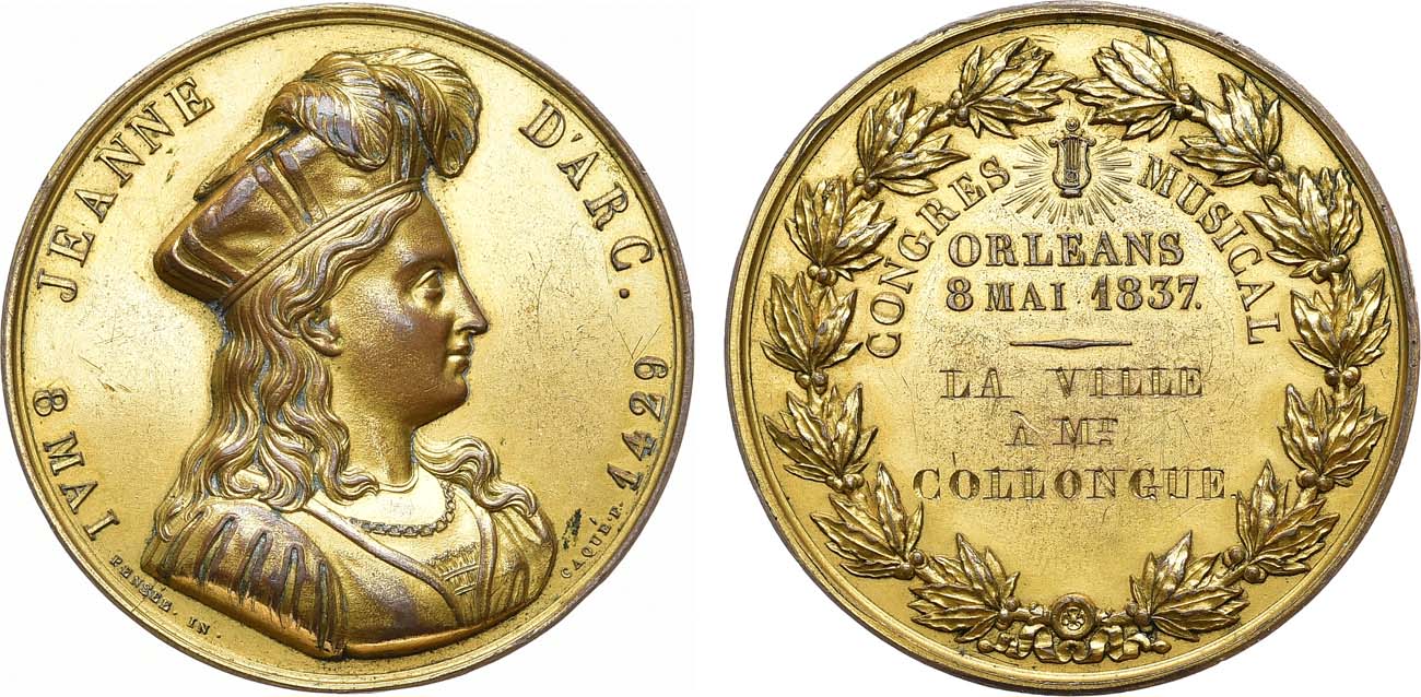 Бронза золочение. 43,32г. Диаметр 45 мм. Франция. Парижский монетный двор. Медальер Арман Огюст Каке (на реверсе справа от бюста "CAQUE.F." ). Аверс: гравировка в поле, в три строки: "LA VILLE/a Mr/COLLONGUE". AU.
