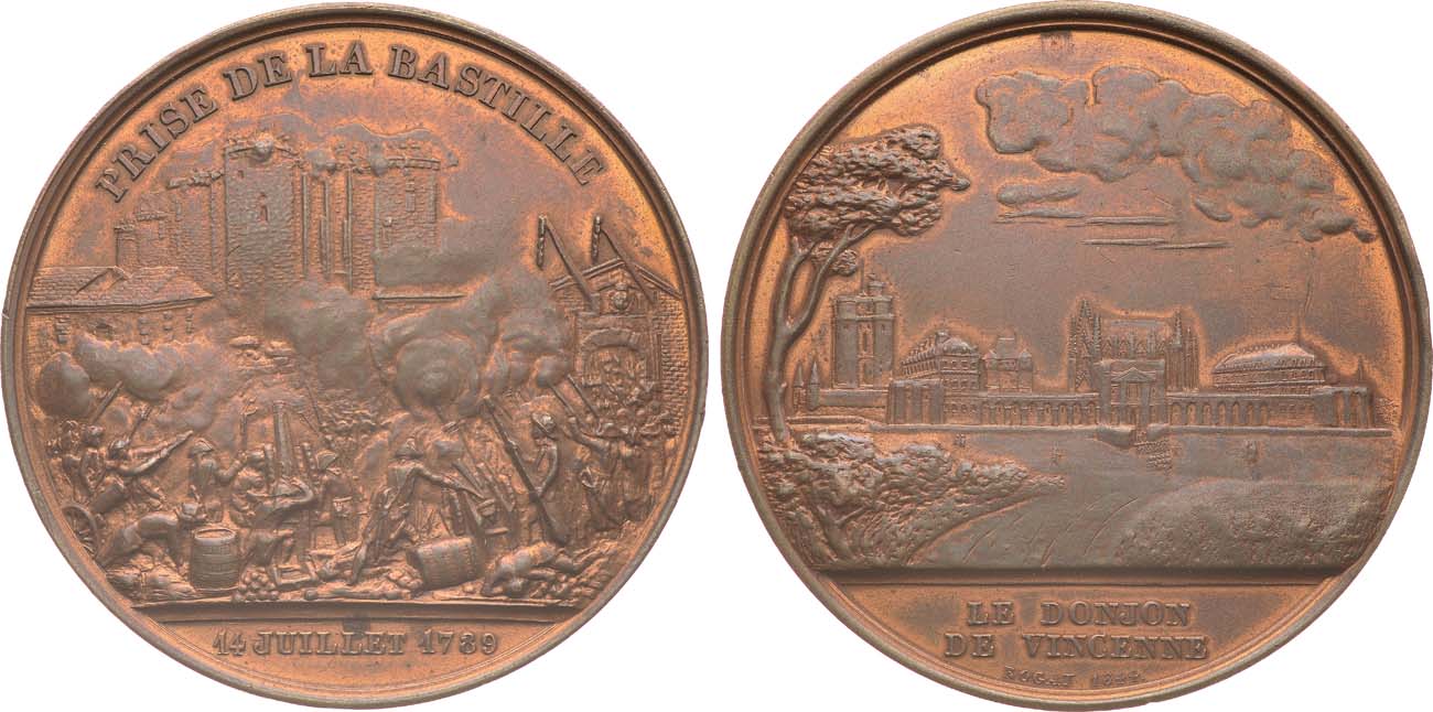 Медь. 44,12г. Диаметр 43 мм. Медальер Эмиль Рогат (на реверсе на 6 часов "ROGAT 1844."). Аверс: сцена взятия Бастилии, на 12 часов надпись "PRISE LA BASTILLE", на 6 часов под обрезом надпись "14 JUILLET 1789". Реверс: вид на Венсенский замок и его донжон, на 6 часов под обрезом надпись "LE DONJON / DE VINCENNE". Надпись на гурте "CUIVRE". AU/UNC.
