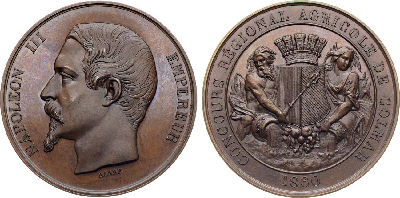 Медь. 62,31г. Диаметр 67 мм. Франция, Парижский монетный двор. Медальер Барре (на аверсе под портретом - "BARRE"). Клейма на гурте: 1. "Указующая рука" (клеймо Парижского монетного двора в период с 26.06.1845-31.10.1860 гг.). 2. Клеймо обозначения металла — "CUIVRE" (медь). UNC.