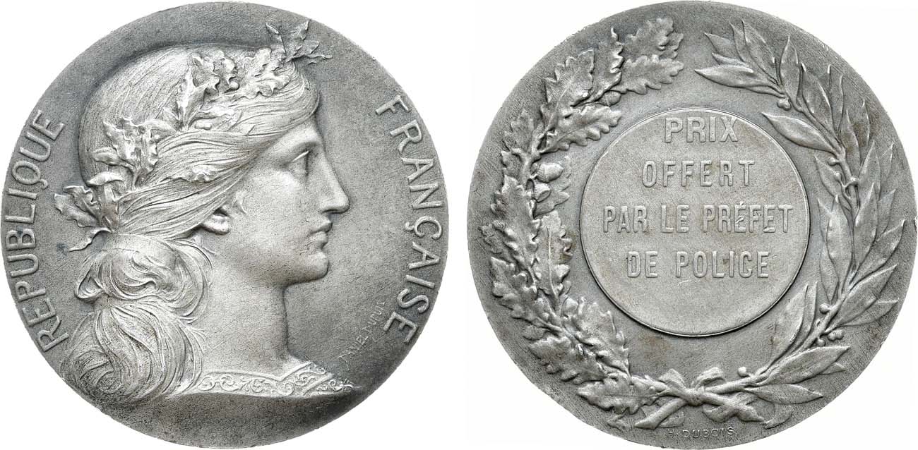 Серебро. 63,57г. Диаметр 50 мм. Парижский монетный двор. Медальеры: Даниэль Дюпуи (на аверсе внизу справа "DANIEL DUPUIT"), Анри-Альфред-Огюст Дюбуа (на реверсе внизу, под венком "H. DUBOIS"). Гурт: снак Парижского монетного двора (Рог изобилия) и "1 ARGENT". UNC-.