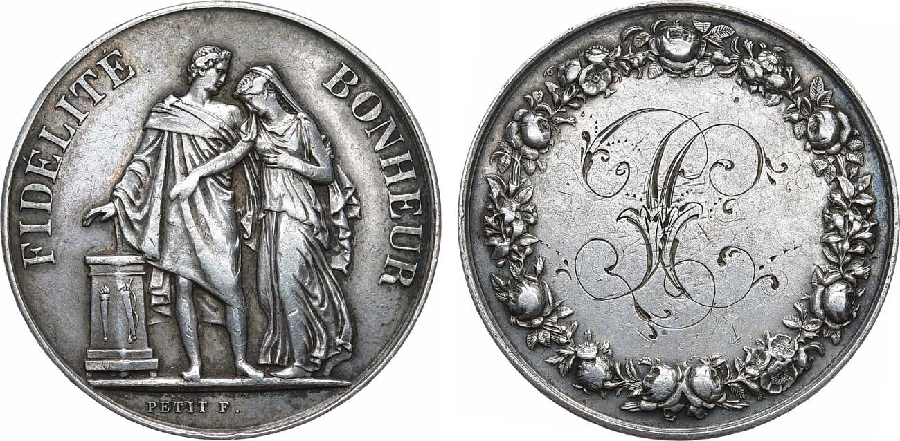 Серебро. 16,4г. Диаметр 32 мм. Парижский монетный двор. Медальер Пети (на аверсе внизу под линией обреза "PETIT F."). Гурт: "ARGENT. A Peltier M. Clabaux unis le 5 novembre 1888". AU.